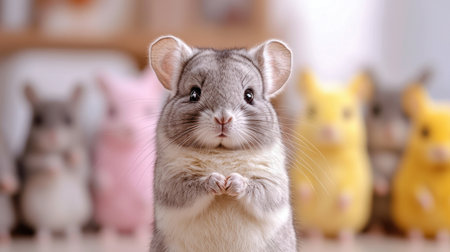 This charming image features a gray chinchilla displaying a curious and adorable expression while surrounded by colorful soft toy animals, creating a lively indoor atmosphere.
