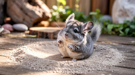 A fluffy chinchilla rolls around in a sandy area, playfully exploring its surroundings in a warm outdoor setting.
