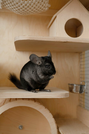 Chinchilla sitting on a shelf in a pet house.