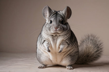 Chinchilla sitting on a beige background. Close up.
