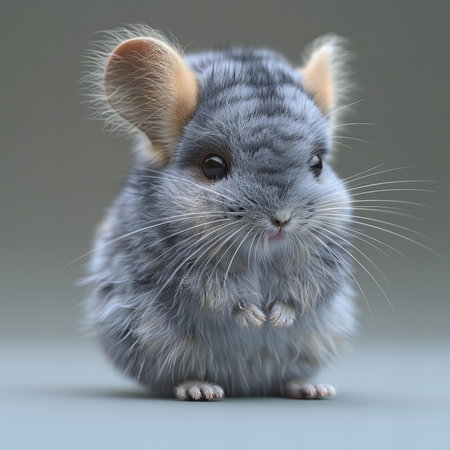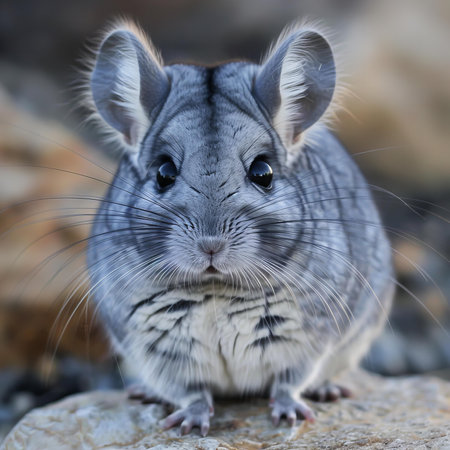 A detailed macro portrait captures the serene and gentle nature of a grey chinchilla. Its incredibly dense, soft fur and curious dark eye invite a sense of calm and tenderness, highlighting the delicate beauty of this exotic pet.
