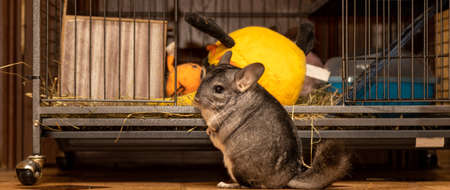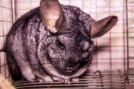 Gray chinchilla in a cage. Close-up view.