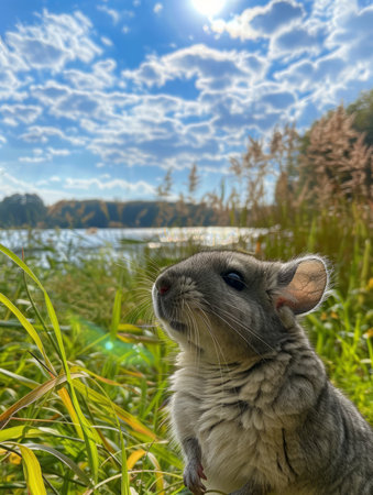 A cute chinchilla sits in tall grass, gazing up at the bright blue sky and fluffy white clouds A perfect photo for animal lovers and nature enthusiasts This image evokes feelings of peace and tranquility AI Generative