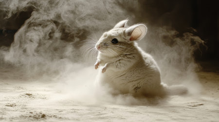 A captivating image of a playful white chinchilla surrounded by soft dust, showcasing its curiosity and agility in a serene, natural environment filled with warmth.