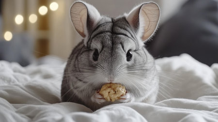 A charming gray chinchilla enjoys a cookie while nestled on a soft white blanket, radiating cuteness and warmth. Perfect image for pet lovers and cozy vibes.