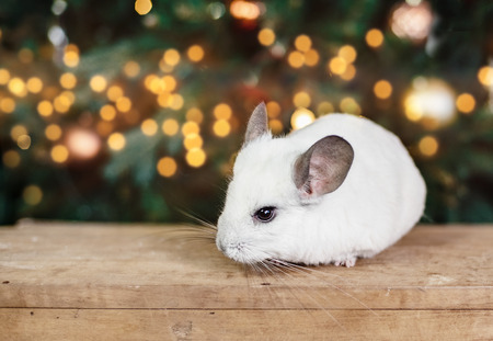 Happy Chinese New Year 2020 year of rat. Portrait of cute white chinchilla on the background of the Christmas tree in the lights, symbol of new year