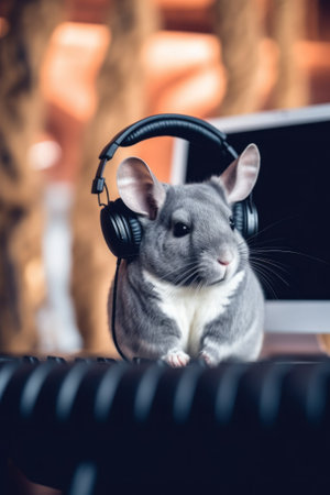 A chinie with headphones sitting on a keyboard. Generative AI image.