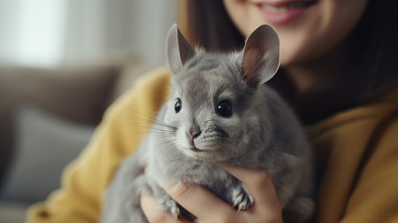Young woman with cute grey chinchilla at home, closeup