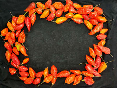 bhut jolokia ghost pepper is coming out of a mug on black background.ghost pepper ( bhut jolokia ) border on black cloth texture background.