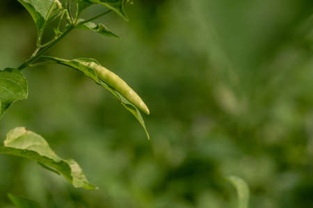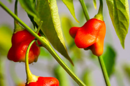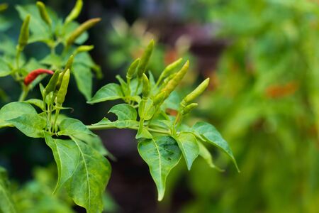 Red chilli pepper in garden farm agriculture, chilli is fruit of plants from the genus Capsicum. Organic red pepper fruit in garden farm agriculture on blurred background on morning in Bali, Indonesia