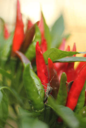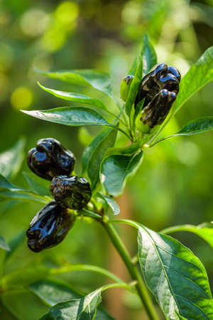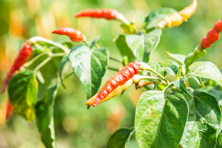 Red and green hot natural peppers grow on the bush against the background of green leaves. Pepper in the garden