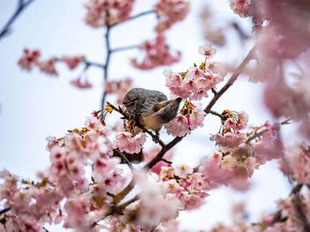 A Japanese brown-eared bulbul songbird in a sakura tree. These common birds are native to Japan and in some areas are considered pests as they can damage crops.