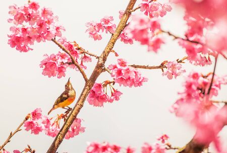 Wild bird with Himalayan Cherry flower or Prunus cerasoides flower of Sakura Thai blossoms at Fang District, Chiang Mai, Thailand