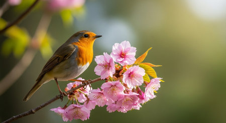 Vibrant Robin Perched on Blossoming Branch in Springtime Light