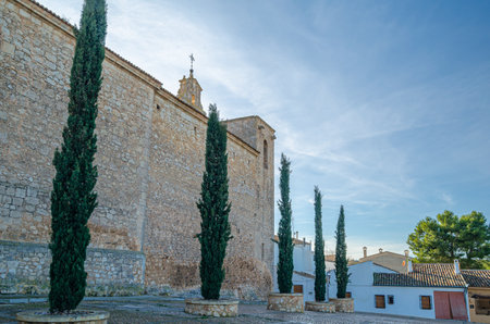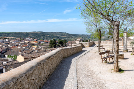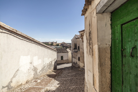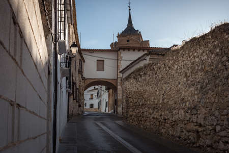 Uclés Old Town streets with a porch and the church dome in the background, Cuenca, Spain