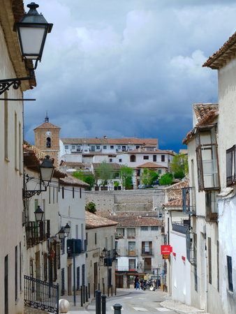 Chinchon, Community of Madrid, Spain - April 11, 2021: touristic village's street under dramatic sky at springtime