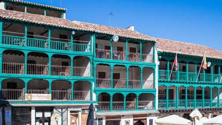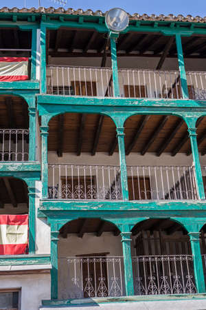 Chinchon, Spain - October 15, 2016: Detail of balconies typical of the century XIX, located in Main square, Touristic village in Madrid province, Chinchon, Spain