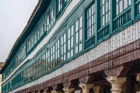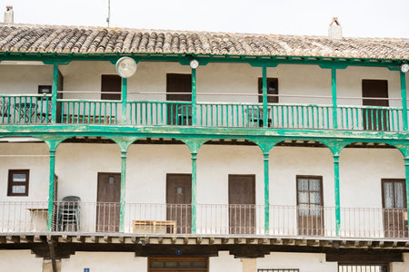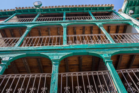 Upward look on authentic Castilian balconies on the buildings facades in Chinchon village, Madrid community, Spain.