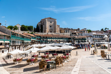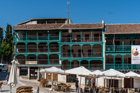 CHINCHON, SPAIN - NOVEMBER 2, 2019: Plaza Mayor (main square) of Chinchon, Spain, built in the 15th century, is an example of popular architecture. It has an irregular shape, the buildings have three floors, with lintelled galleries and wooden balconies s