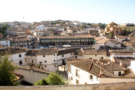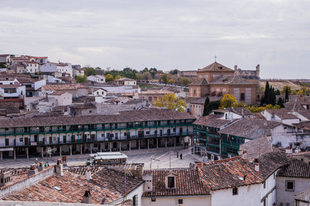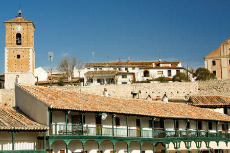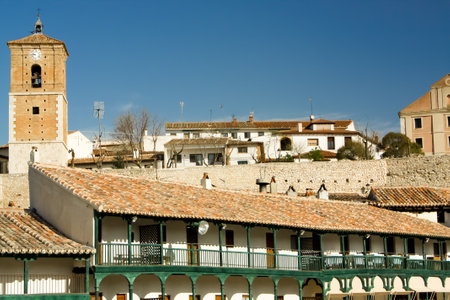 Spanish plaza views, traditional rooftops, architectural details, essence of historic Chinchón captured