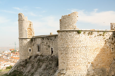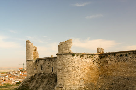 Panoramic view of the historic town of Astudillo, Spain, showing the medieval La Mota Castle and traditional hillside wineries. Captures rural charm and architectural heritage.