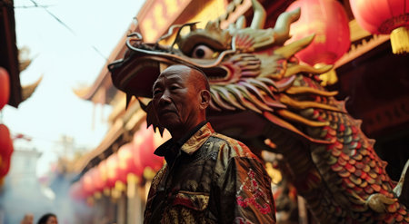 A Dragon parade celebration in chinese street with traditional costume lantern culture and crowd festival