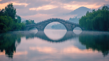 A serene bridge connects two riverbanks surrounded by misty mountains at dawn, creating a peaceful atmosphere.