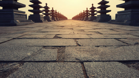 A view of a stone path leading through an ancient urban area with a balanced arrangement of stone structures under the evening sky.