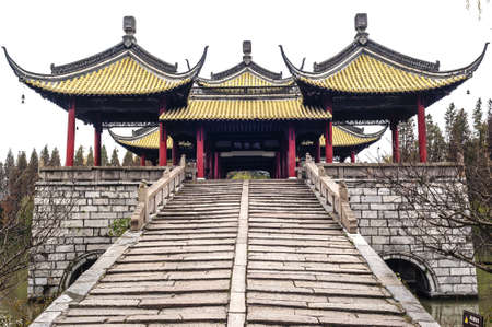 Landscape of traditional Chinese bridge in the park at sunset, Suzhou, China