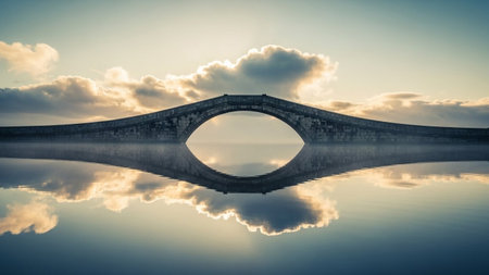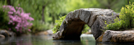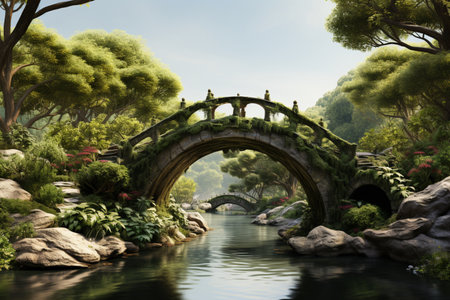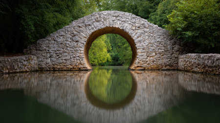 A captivating stone arch bridge elegantly spans crystal-clear water, surrounded by lush greenery. The tranquil scene reflects nature's beauty and peaceful atmosphere.