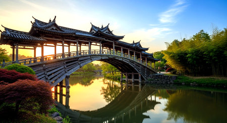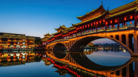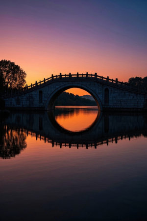 A serene view of a Chinese bridge arching over a calm river at dusk. No people, copy space.