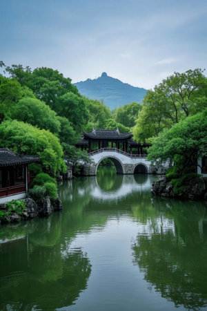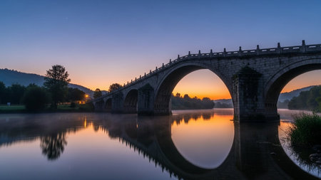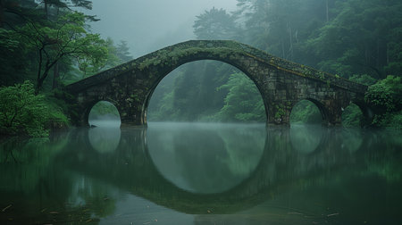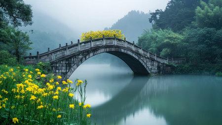 Capture the serene beauty of an ancient stone bridge arching over a calm river, surrounded by lush greenery and majestic mountains. Perfect for nature lovers.
