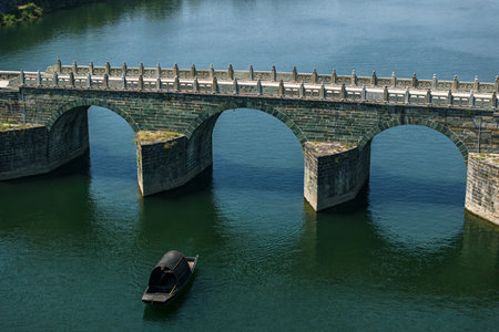 Haoshang arch bridge in oriental Buddha park and small fishing boats on the river in Leshan Sichuan China