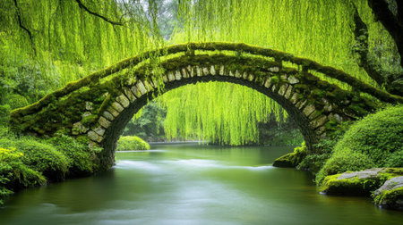 Moss-covered stone bridge over a tranquil river, surrounded by weeping willows gently touching the water