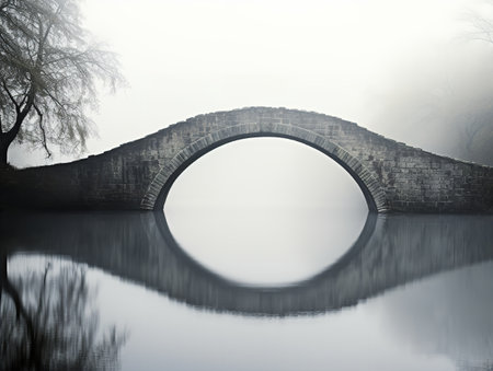 Ancient stone bridges reflect in the river while a network stability design overlays the scene in broad daylight.