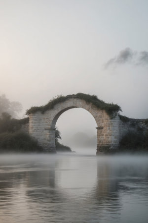 AI Generated. A Mystical Stone Archway Over a Foggy River