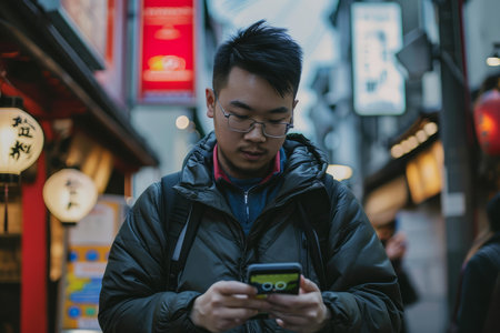 Focused young adult navigates his phone with urban nightlife beginning to glow around him