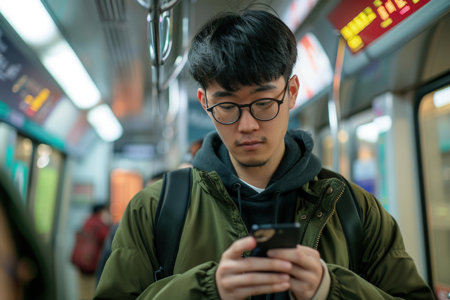 Young man wearing glasses using a smartphone while traveling in the style of train.