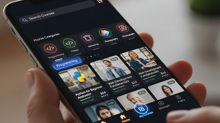 Lod, Israel - July 8, 2020: SoloLearn - Learning coding app launch screen with logo on the display of a black mobile smartphone on a metallic background. Close up top view flat lay.