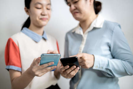 Generative AI : Group of asian sitting use smartphone and laptop at coffee shop Social network and technology concept connection internet chatting