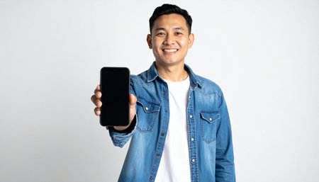 A confident and friendly Asian man in a casual denim shirt smiles as he presents a smartphone with a blank screen.