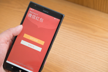 Zhongshan,China-Feb 21,2016:preparing a mobile red pocket for Chinese new year.FEB 8 is the 1st day of Year of Monkey & sending receiving red pockets online is very popular in China.