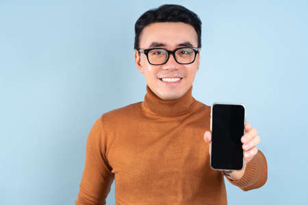 Asian man posing on blue background