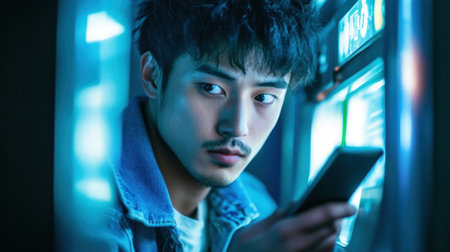 Young Man Using at Night Near ATM in Neon Light.