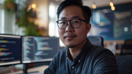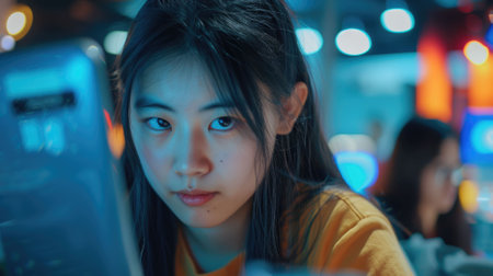 The picture of the east asian girl is working as the coding programmer inside the office and blur background, the programmer require skill like coding, logical thinking, patience and debugging. AIG43.