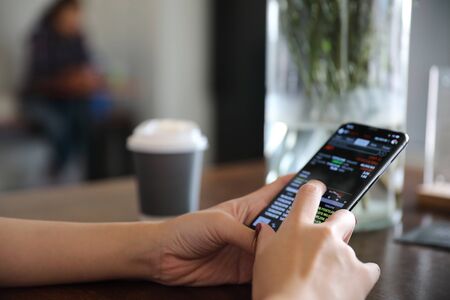 Female hand with smartphone trading stocks online in coffee shop Business concept