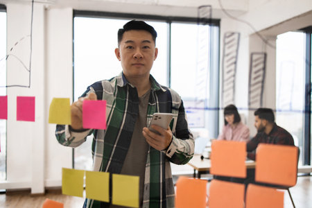 Young professional brainstorming with sticky notes in office