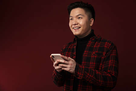 Image of cheerful asian man smiling and using mobile phone isolated over burgundy background