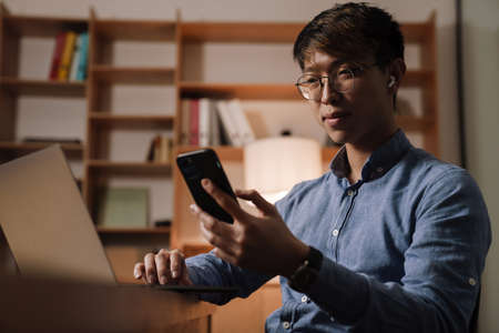 Focused asian guy in earphones using mobile phone while working with laptop in office