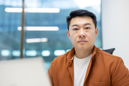 Asian businessman in office wears casual attire, focusing on laptop work in modern environment. Background includes natural light and creative workspace elements enhancing productivity.